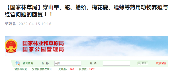 【國家林草局】穿山甲、蛇、蛤蚧、梅花鹿、蟾蜍等藥用動物養殖與經營問題的回復!!